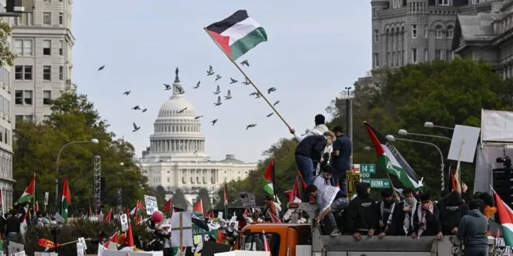 İsrail’in Gazze’ye saldırılarını ve sivil halkı öldürmesini protesto eden eylemciler, “İsrail ırkçılığına giden tüm ABD fonlarını sonlandırın” yazan dövizler taşırken ABD Dışişleri Bakanlığının kapatılması gerektiğini dile getirdi.