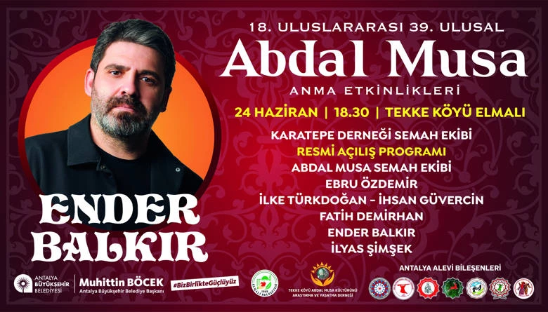 Antalya Büyükşehir Belediyesi, Elmalı Belediyesi, Tekke Köyü Abdal Musa Kültürünü Araştırma ve Yaşatma Derneği, Kültür ve Turizm Bakanlığı’nın destekleriyle düzenlenecek Abdal Musa Anma Etkinlikleri 23-24-25 Haziran’da Elmalı İlçesi Tekke Mahallesi’nde gerçekleştirilecek.