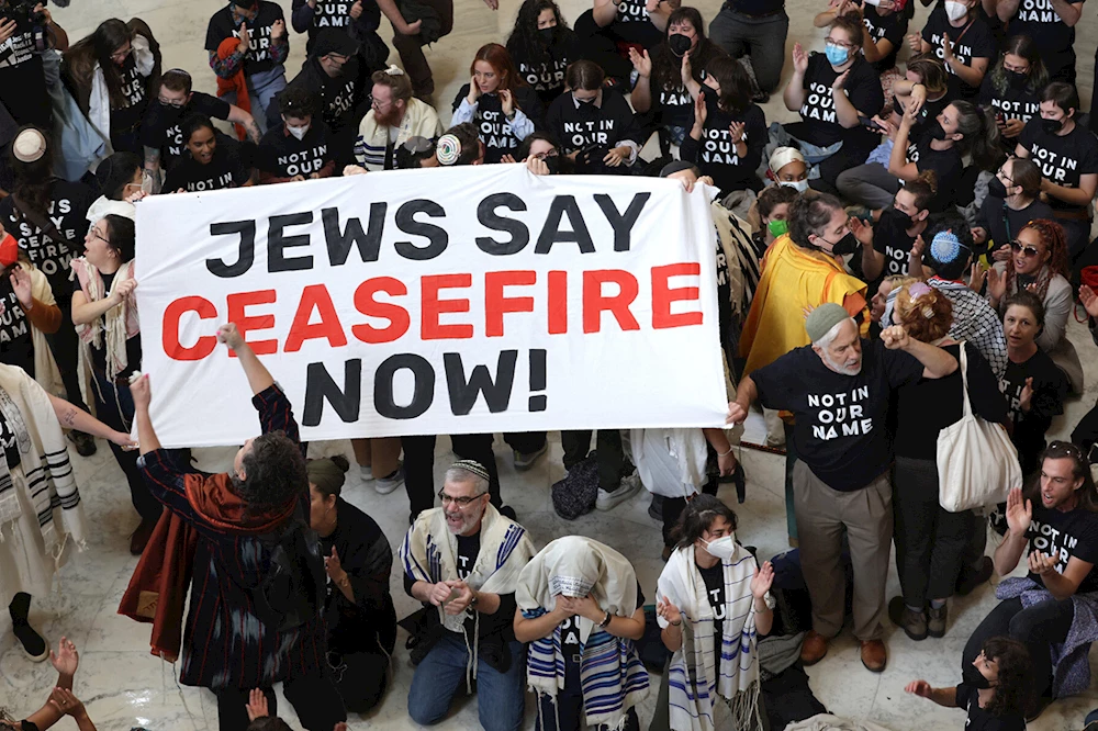 Jewish Voice for peace (Barış İçin Yahudilerin Sesi) örgütünden 10 bin Yahudi aktivist, Filistin'deki soykırıma son verilmesi için Washington'da bir araya geldi ABD Kongresi önündeki Yahudi göstericilerin 'Amerikalı Yahudiler ateşkes istiyor, Filistinlilere karşı soykırımı durdurun' sloganlarıyla toplandığı kaydedildi. Açıklamada, 'Bugün 500 Yahudi gözaltına alındı ve 10 bin Yahudi ateşkes ve Filistinlilere yönelik soykırıma son verilmesini desteklemek ve talep etmek için sokaklara döküldü' denildi.