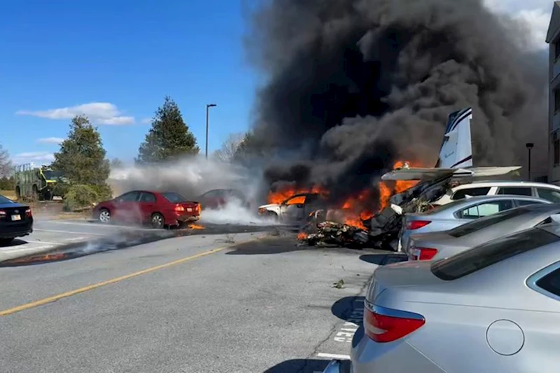 Kalkış sırasında kapısı açık olan küçük uçak, banliyödeki bir otoparka sert bir iniş yaparak alevler içinde kaldı.