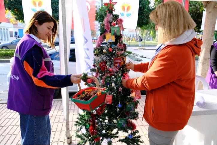 Kadın Emeği Pazarı’nda kurulan yılbaşı ağacına, kadın daire tarafından toplumsal cinsiyet eşitliğine vurgu yapmak için hazırlanan kartlar, üretici kadınlar ve ziyaretçiler tarafından asıldı.