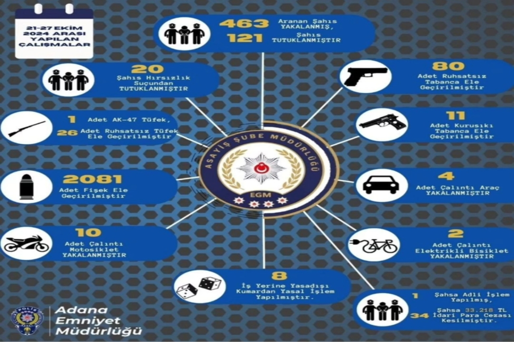 Adana Emniyet Müdürlüğü, 21-27 Ekim 2024 tarihleri arasında gerçekleştirdiği çalışmalarda önemli sonuçlar elde etti.