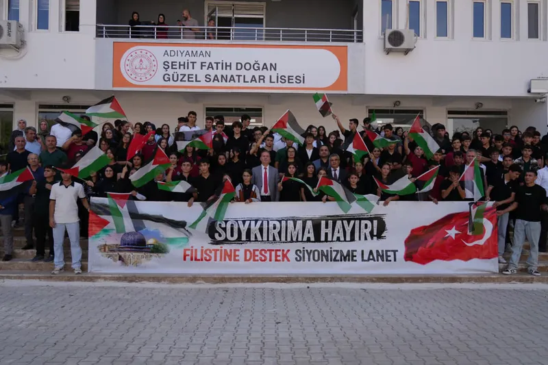 Şehit Fatih Doğan Güzel Sanatlar Lisesi öğretmen ve öğrencileri de okul bahçesinde bir araya gelerek, ellerinde "Soykırıma Hayır! Filistin’e Destek, Siyonizme Lanet" yazılı afişlerle Filistin temalı şarkılar eşliğinde farkındalık etkinliği düzenledi.