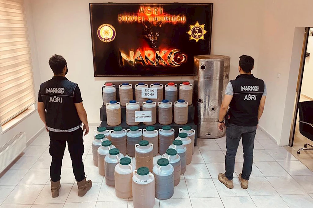 Ağrı'da durdurulan İran plakalı tırda, yakıt deposuna gizlenmiş 537 kilo 250 gram likit metamfetamin ele geçirildi.