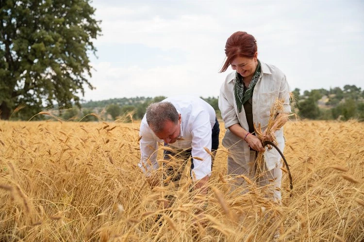 Konuşmaların ardından Başkan Seçer eşi Meral Seçer ile birlikte buğday hasadı yaptı ve üreticilerin buğdaydan elde ettikleri unla yaptıkları sıkmanın tadına baktı.