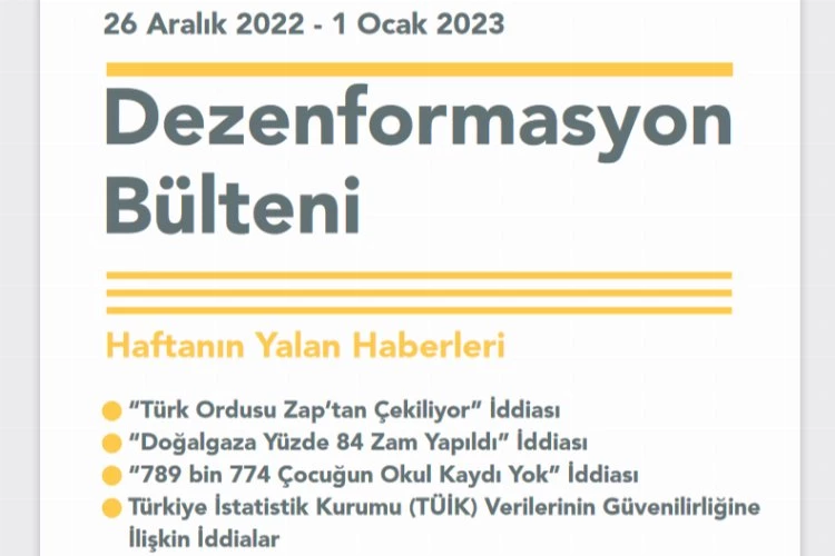 ANKARA (İGFA) - İletişim Başkanlığı'nca 26 Aralık 2022-1 Ocak 2023'ü kapsayacak şekilde hazırlanan Dezenformasyon Bülteni yayımlandı.