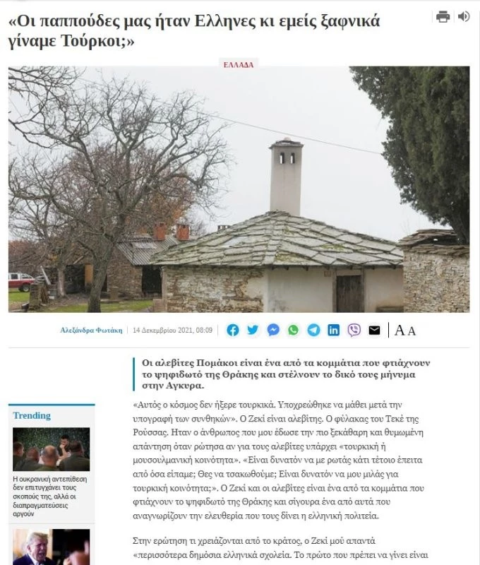 Yunanistan’da yaşayan Alevilerin üzerinde “Ankara’nın etkisinin yok denecek kadar az” olduğunu tespit eden Alexandra Fotaki, Türkiye’de 25 milyon “zulüm gören” Alevilere karşılık, Yunanistan’da Alevilerin “Yunan devletinin koruması altında” olduğunu da ekliyor!
