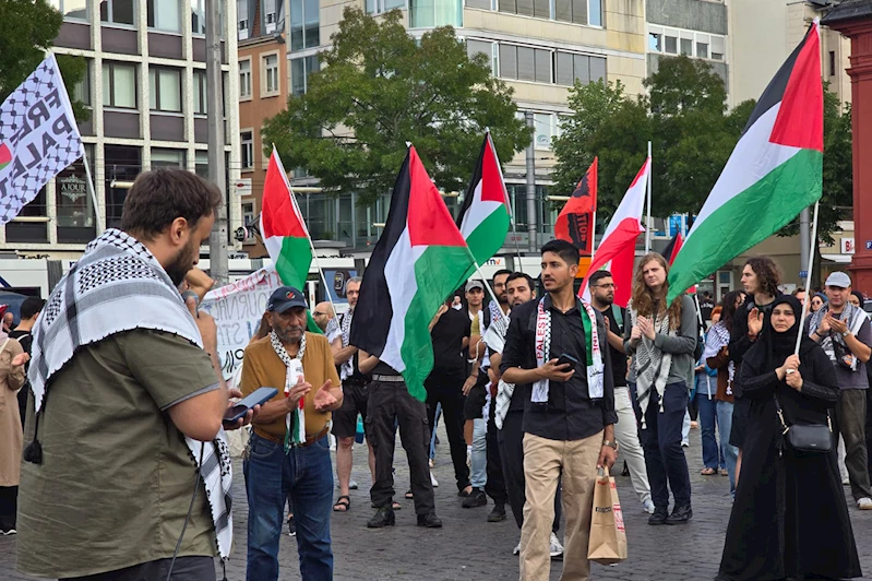 Marktplatz meydanında toplanan grup, "Free Palestine", "israil Apartheid Devletidir" ve "Halk Katliamı Halk Katliamıdır" sloganları attı.