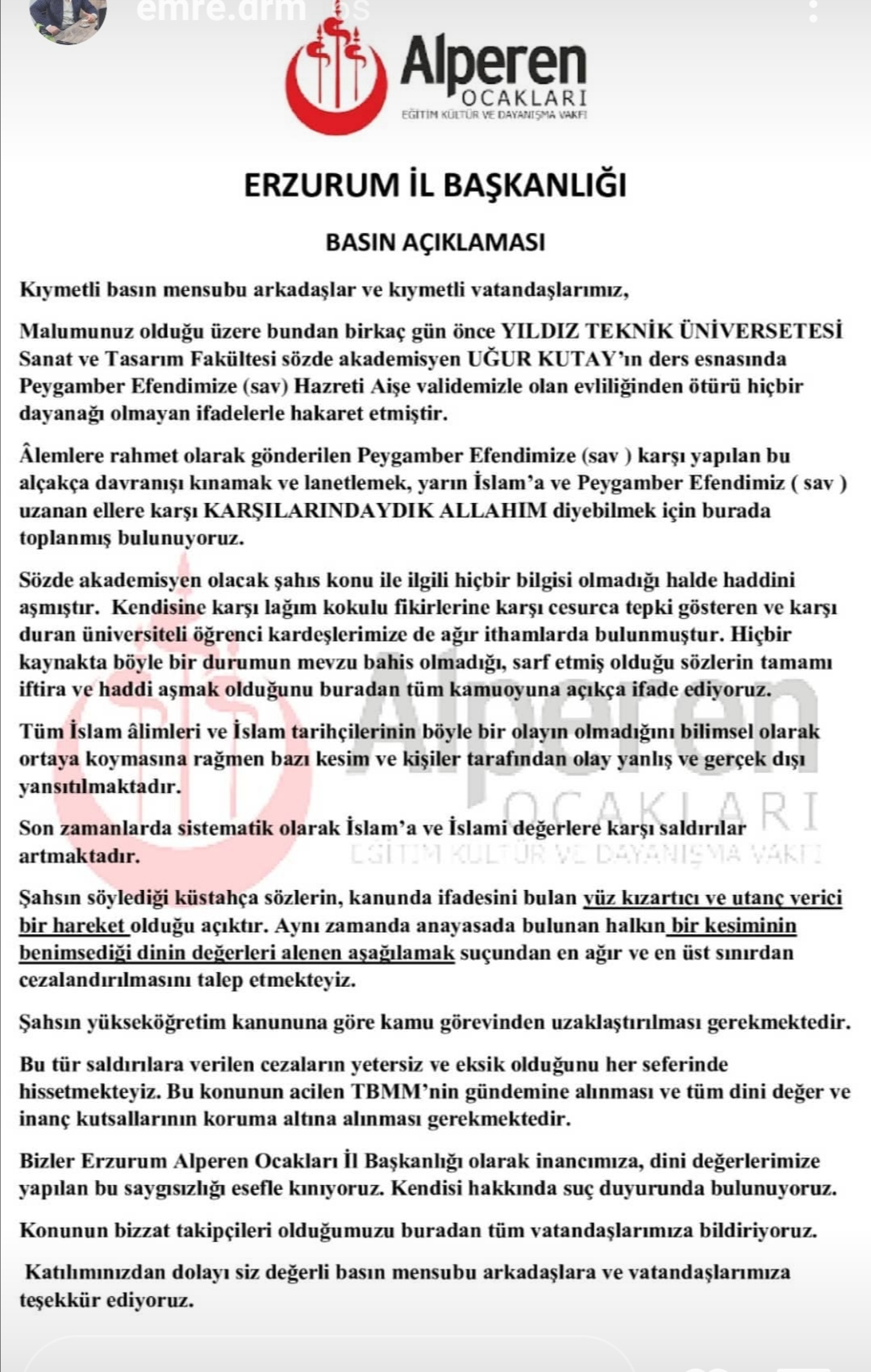ERZURUM İL BAŞKANLIĞI BASIN AÇIKLAMASI Kıymetli basın mensubu arkadaşlar ve kıymetli vatandaşlarımız, Malumunuz olduğu üzere bundan birkaç gün önce YILDIZ TEKNİK ÜNİVERSETESİ Sanat ve Tasarım Fakültesi sözde akademisyen UĞUR KUTAY'in ders esnasında Peygamber Efendimize (sav) Hazreti Aişe validemizle olan evliliğinden ötürü hiçbir dayanağı olmayan ifadelerle hakaret etmiştir. Ålemlere rahmet olarak gönderilen Peygamber Efendimize (sav) karşı yapılan bu alçakça davranışı kınamak ve lanetlemek, yarın İslam'a ve Peygamber Efendimiz (sav) uzanan ellere karşı KARŞILARINDAYDIK ALLAHIM diyebilmek için burada toplanmış bulunuyoruz. Sözde akademisyen olacak şahıs konu ile ilgili hiçbir bilgisi olmadığı halde haddini aşmıştır. Kendisine karşı lağım kokulu fikirlerine karşı cesurca tepki gösteren ve karşı duran üniversiteli öğrenci kardeşlerimize de ağır ithamlarda bulunmuştur. Hiçbir kaynakta böyle bir durumun mevzu bahis olmadığı, sarf etmiş olduğu sözlerin tamamı iftira ve haddi aşmak olduğunu buradan tüm kamuoyuna açıkça ifade ediyoruz. Tüm İslam âlimleri ve İslam tarihçilerinin böyle bir olayın olmadığını bilimsel olarak ortaya koymasına rağmen bazı kesim ve kişiler tarafından olay yanlış ve gerçek dışı OCAKLARI Son zamanlarda sistematik olarak İslam'a ve İslami değerlere karşı saldırılar yansıtılmaktadır. artmaktadır. EST. KUL OR V LAYANISMA VAKT Şahsın söylediği küstahça sözlerin, kanunda ifadesini bulan yüz kızartıcı ve utanç verici bir hareket olduğu açıktır. Aynı zamanda anayasada bulunan halkın bir kesiminin benimsediği dinin değerleri alenen aşağılamak suçundan en ağır ve en üst sınırdan cezalandırılmasını talep etmekteyiz. Şahsın yükseköğretim kanununa göre kamu görevinden uzaklaştırılması gerekmektedir. Bu tür saldırılara verilen cezaların yetersiz ve eksik olduğunu her seferinde hissetmekteyiz. Bu konunun acilen TBMM'nin gündemine alınması ve tüm dini değer ve inanç kutsallarının koruma altına alınması gerekmektedir. Bizler Erzurum Alperen Ocakları İl Başkanlığı olarak inancımıza, dini değerlerimize yapılan bu saygısızlığı esefle kınıyoruz. Kendisi hakkında suç duyurunda bulunuyoruz. Konunun bizzat takipçileri olduğumuzu buradan tüm vatandaşlarımıza bildiriyoruz. Katılımınızdan dolayı siz değerli basın mensubu arkadaşlara ve vatandaşlarımıza teşekkür ediyoruz.
