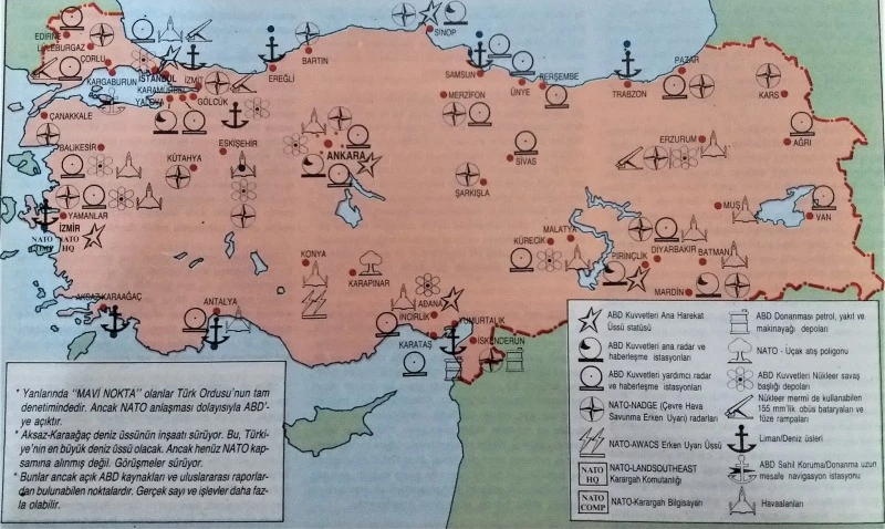 Çünkü; İstanbul, Diyarbakır, İzmir, Adana, Malatya ve Ankara’da birden fazla yabancı askeri tesisin olduğu ve Türkiye’nin yedi bölgesinde ABD ve NATO’ya bağlı askeri üslerin bulunduğu hemen göze çarpanlar arasında yer almakta.