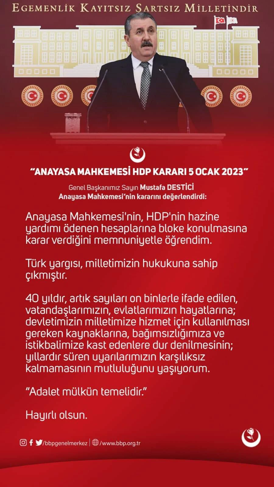 Hdp'ye ödenen hazine yardımının kesilmesi teklifin ilk olarak gündeme getiren ve büyük bir titizlikle takip eden Büyük Birlik Partisi Genel Başkanı Sayın Mustafa Destici Anayasa Mahkemesinin kararını değerlendirdi. Genel Başkan Destici 'Anayasa Mahkemesi'nin, HDP'nin hazine yardımı ödenen hesaplarına bloke konulmasına karar verdiğini memnuniyetle öğrendim. Türk yargısı, milletimizin hukukuna sahip çıkmıştır. 40 yıldır, artık sayıları on binlerle ifade edilen, vatandaşlarımızın, evlatlarımızın hayatlarına; devletimizin milletimize hizmet için kullanılması gereken kaynaklarına, bağımsızlığımıza ve İstikbalimize kast edenlere dur denilmesinin; yıllardır süren uyarılarımızın karşılıksız kalmamasının mutluluğunu yaşıyorum. 'Adalet mülkün temelidir.' Hayırlı olsun.'dedi