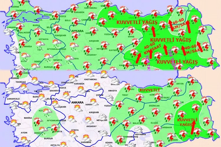 KUVVETLİ YAĞIŞ UYARISI: Yağışların: Orta ve (Artvin hariç) Doğu Karadeniz, (Van ve Iğdır hariç) Doğu Anadolu ile K.Maraş, Adana, Osmaniye, Adıyaman, Diyarbakır, Batman, Mardin ve Siirt çevrelerinde yer yer kuvvetli olması beklendiğinden yaşanabilecek olumsuzluklara karşı dikkatli ve tedbirli olunması gerekmektedir.