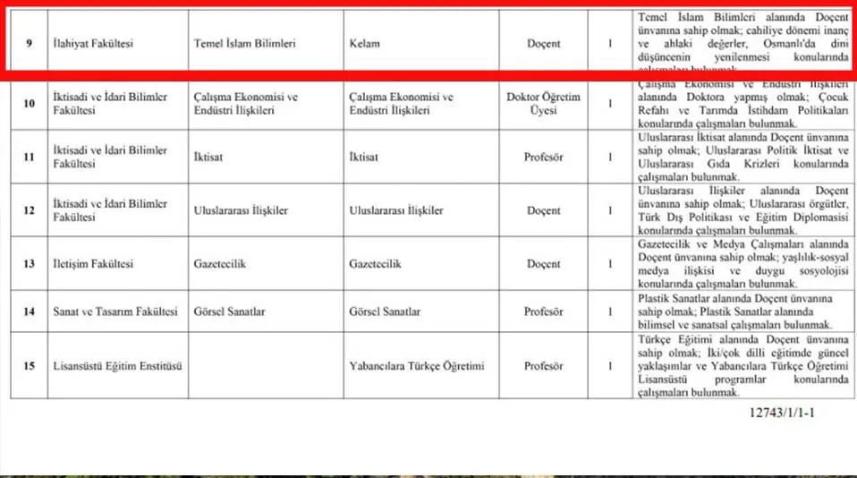 Ankara Hacı Bayram Veli Üniversitesi 'nin 30 Aralık 2024 tarihli Resmi Gazete ’de yayımlanan akademik ilanı, İlahiyat Fakültesi Temel İslam Bilimleri Bölümü Kelam Anabilim Dalı'nda doçent kadrosu için aranan şartlar nedeniyle tartışmalara neden oldu.