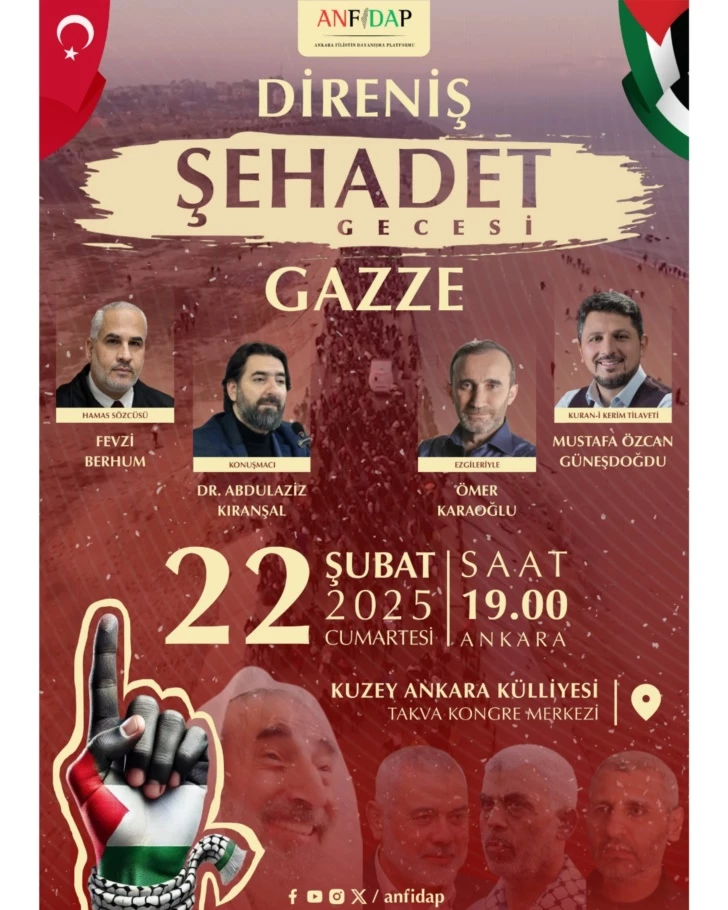 Başkent Ankara'da, Ankara Filistin Dayanışma Platformu (ANFİDAP) tarafından "Şubat Ayı Şehadet Ayı" kapsamında "Direniş, Şehadet ve Gazze" sloganıyla program gerçekleştirilecek.
