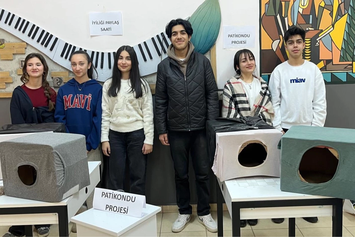 "Patikondu" adını verdikleri projeyle lise öğrencileri, koli ve atık malzemelerden kedi yuvaları tasarladı.