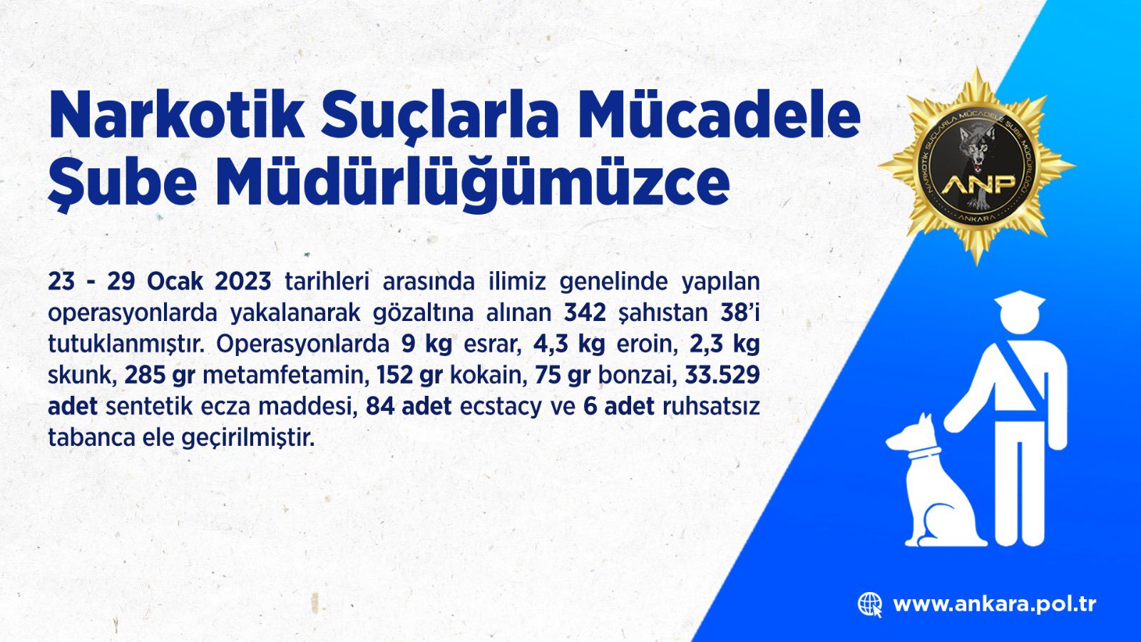 Ankara Cumhuriyet Başsavcılığı koordinesinde, 23 - 29 Ocak'ta il genelinde operasyonlar düzenlendi. Operasyonda 342 şüpheli gözaltına alındı. Emniyetteki işlemlerinin ardından adliyeye sevk edilen şüphelilerden 38'i tutuklandı. Şüphelilerle birlikte çok sayıda uyuşturucu madde ve 6 ruhsatsız tabanca ele geçirildi.