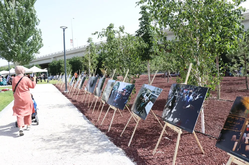 Gazze'deki çatışmaların fotoğraflarının sergilendiği etkinlikte, Filistin'e destek içerikli pankartlar ve dövizler alana asıldı.