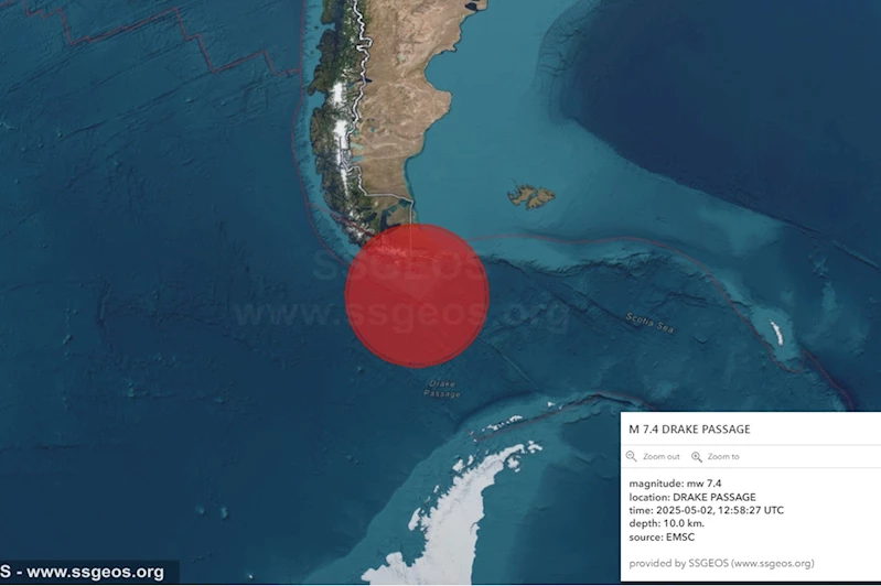 ABD Jeoloji Araştırmaları Kurumu, Şili ve Arjantin'in güney kıyılarında 7,4 büyüklüğünde bir deprem meydana geldiğini bildirdi.