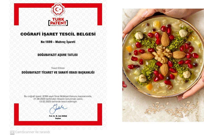 Doğubayazıt Aşure Tatlısı, Türk Patent ve Marka Kurumu tarafından coğrafi işaret tescili aldı. Tescil, bölgenin kültürel mirasının korunması ve tanıtılması açısından büyük bir anlam taşıyor.