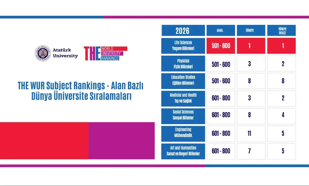 THE 2026 alan bazlı sonuçlarına göre Atatürk Üniversitesi 11 alanın 6’sında Türkiye’deki 208 Üniversite içerisinde ilk 10’da yer alarak büyük bir başarıya imza attı.