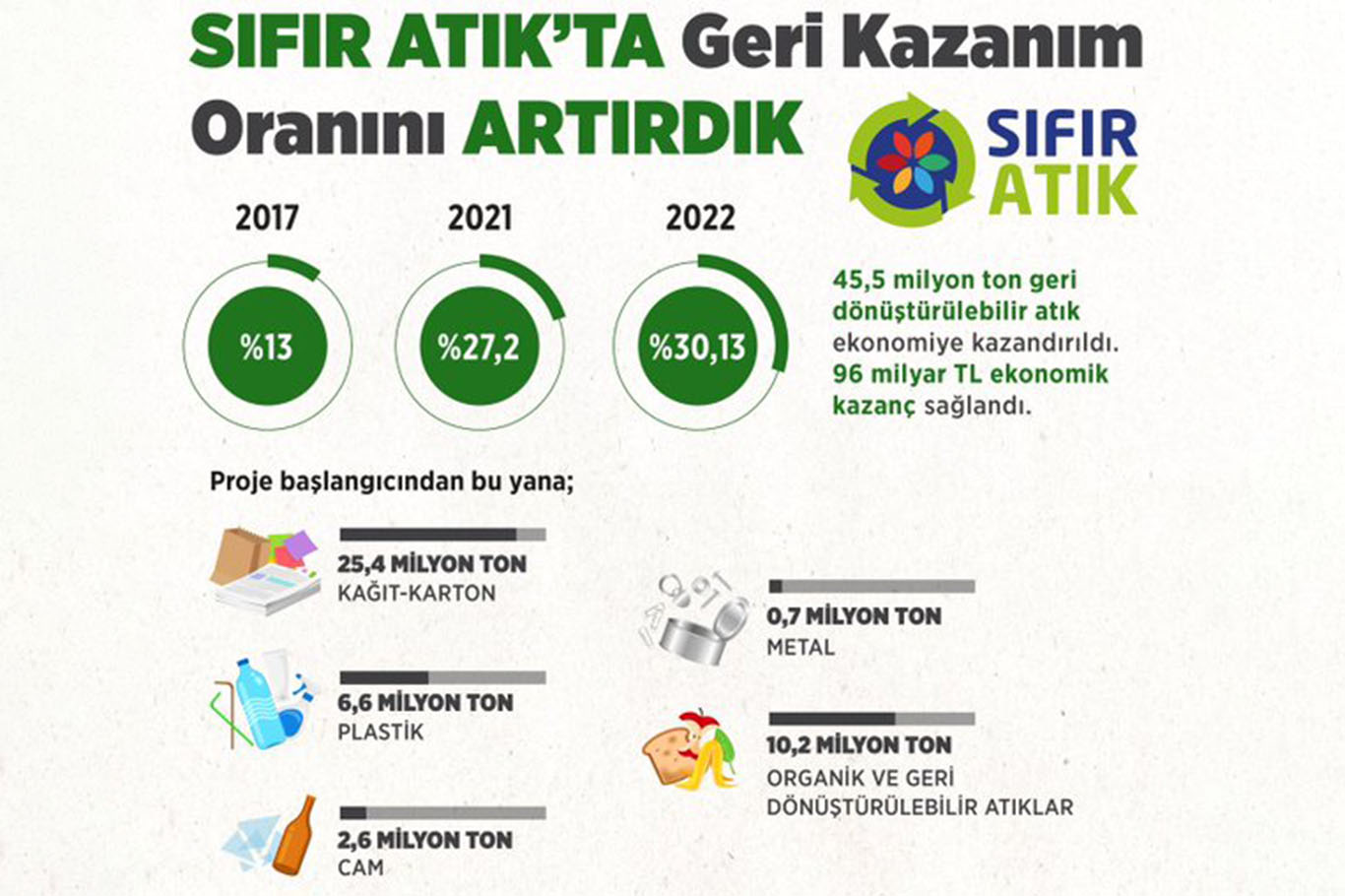 Sosyal medya hesabından sıfır atık projesiyle ilgili açıklamalarda bulunan Bakan Kurum, ekonomiye 45,5 ton atık kazandırdıklarını ifade etti. Bakan Kurum, 'Geri kazanım oranımızı yüzde 5 artırdık, yüzde 30'a çıkardık. 45,5 milyon ton atığı ekonomiye kazandırdık. Bu yıl yüzde 35'e yükselteceğiz!' dedi.