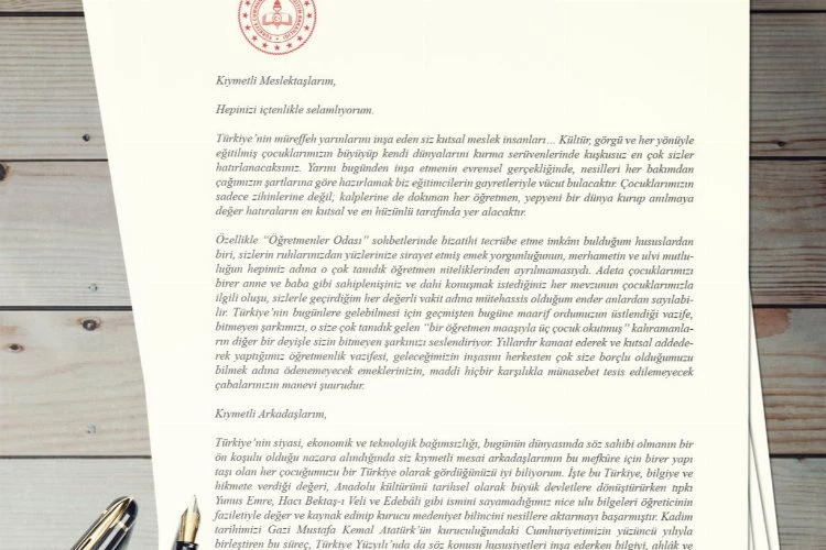 ANKARA (İGFA) - Yeni eğitim öğretim dönemi dolayısıyla Öğretmenlere kısa mesaj gönderen Millî Eğitim Bakanı Yusuf Tekin, 'Sevgili Meslektaşım, Cumhuriyetimizin 100. yılını 'Türkiye Yüzyılı'na taşıyacak siz değerli öğretmenlerimiz için duygu ve düşüncelerimi ifade eden mektubu sizlerle paylaşıyorum.' ifadelerini kullandı.