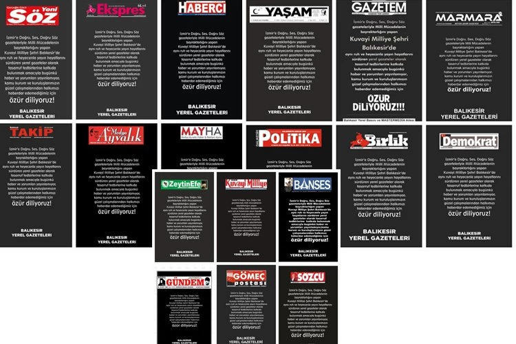 Yerel gazeteler, bugünkü gazete manşetlerinde ve internet haber sitelerinin manşetlerinde, “İzmir’e Doğru, Ses, Doğru Söz gazeteleriyle Milli Mücadelenin bayraktarlığını yapan Kuavyi Milliye Şehri Balıkesir’de aynı ruh ve heyecanla yayı hayatlarını sürdüren yerel gazeteler olarak tasarruf tedbirlerine katkıda bulunmak amacıyla bugünkü haber ve yorumları yayınlamıyor, kamu kurum ve kuruluşlarımızın güzel çalışmalarından halkımızı haberdar edemediğimiz için özür diliyoruz. Balıkesir Yerel Gazeteleri.” ifadelerine yer verildi.