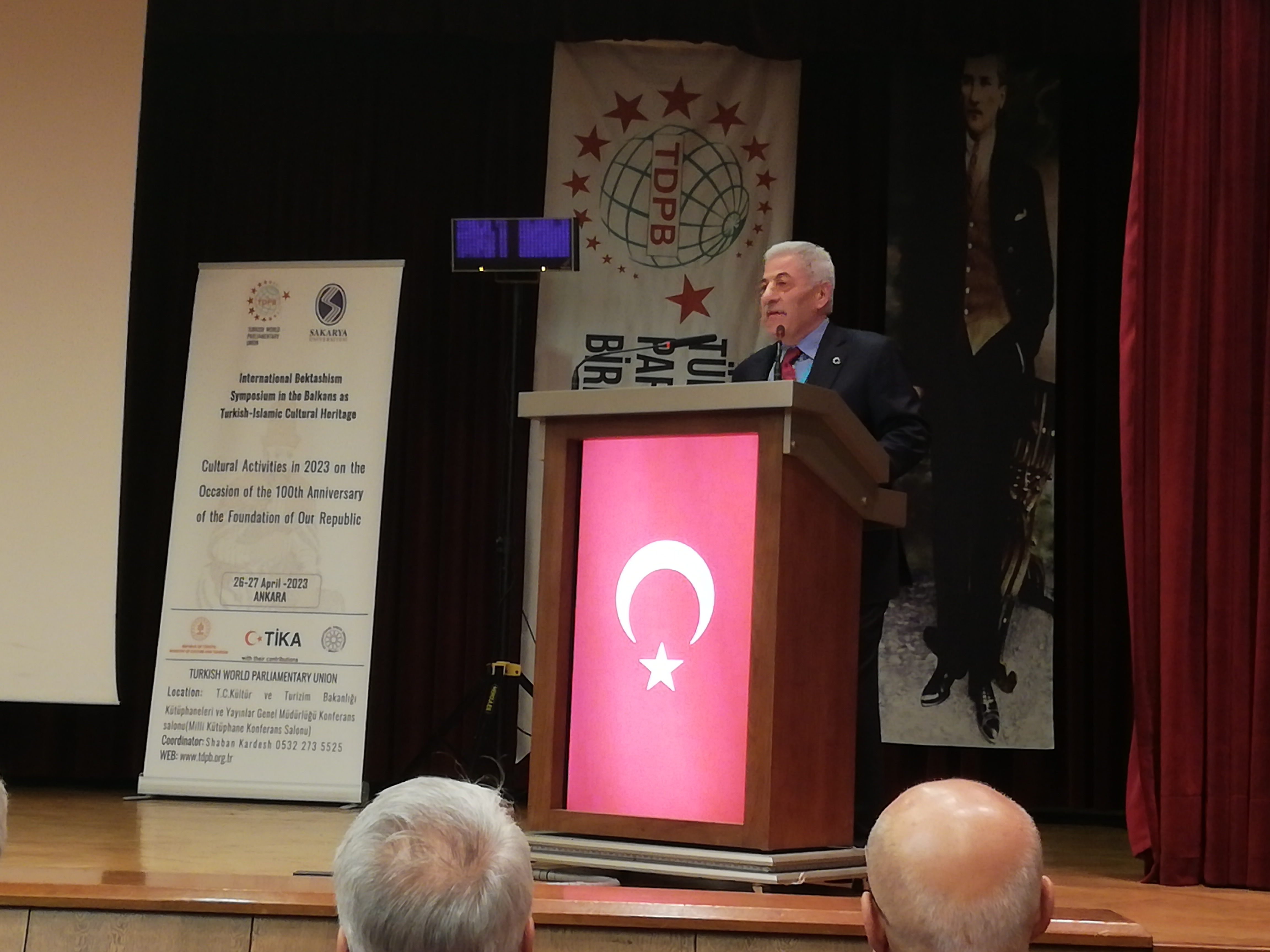 TDPB’nin Kültür ve Turizm Bakanlığı, Sakarya Üniversitesi ve TİKA iş birliği ile gerçekleşecek uluslararası sempozyumda, 26-27 Nisan 2023 tarihlerinde Millî Kütüphane Konferans Salonunda bilimsel bildiriler sunuldu. 26 Nisan saat 10.00’da “Açılış Oturumu”, saat 12.00-18.00 saatleri arasında “I., II., III. Oturum”, saat 18.30-19.00’da “Değerlendirme Oturumu” ile sona erdi. Doğan Kaplan’ın Moderatörlüğündeki “Açılış Oturumu”nda Prof. Dr. Ramazan Biçer “Bektaşi Nefeslerinde Matüridi Temalar, Doğan Kaplan “Velayetname Bağlamında Hacı Bektaş Veli’nin Sosyal Çevresi”, Prof. Dr. Cenksu Üçer, “Demir Baba Velayetnamesinde Yer Alan İnanç Unsurları Üzerine Bir Değerlendirme” Doç. Dr. Recep Önal, “Türk-İslam Düşünce Tarihinde Matüridilik-Bektaşilik Etkileşimi: Benzerlik ve Farklılıklar” adlı bildiriler sundular. I., II. ve III. Oturumlarda “Balkanlar’da Bektaşilik” teması ele alındığı şölende, Balkanlardaki Türk-İslam kültürü bağlamında ve Türkiye’nin Balkanlardaki teo-stratejisi ve teo-diplomasisi açısından Bektaşiliğin sosyo-kültürel ve teolojik yönlerinin anlatılacağı anlatıldı.