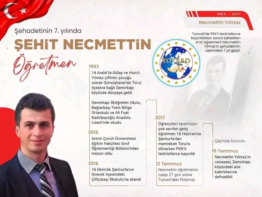 Şehit öğretmenimiz Necmettin Yılmaz, görev yaptığı Şanlıurfa’dan memleketi Gümüşhane’ye dönerken hain pusuda katledildi.