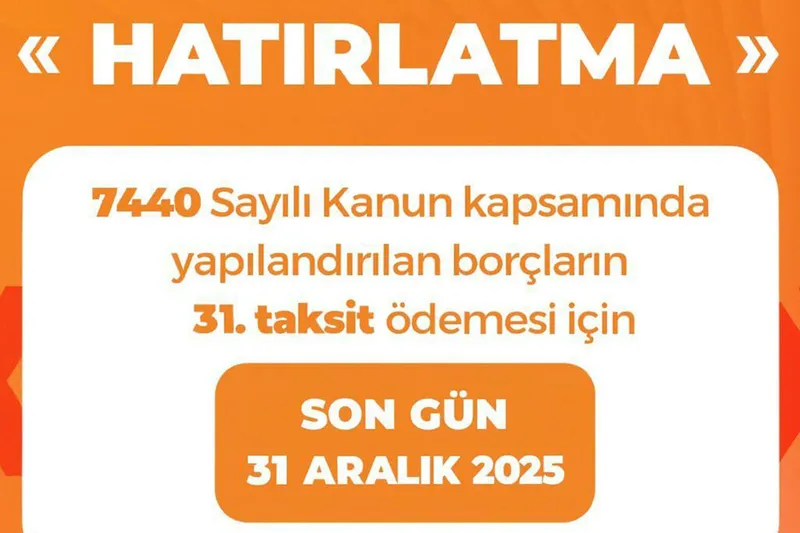 Defterdarlık tarafından yapılan bilgilendirmeye göre; 2025 yılı içerisinde yapılandırılan borçlara ait üç taksiti süresinde ödememiş veya eksik ödemiş olan mükelleflerin, aralık ayında ödenmesi gereken 31’inci taksiti, en geç 31 Aralık 2025 Çarşamba günü mesai bitimine kadar ödemeleri gerekiyor.