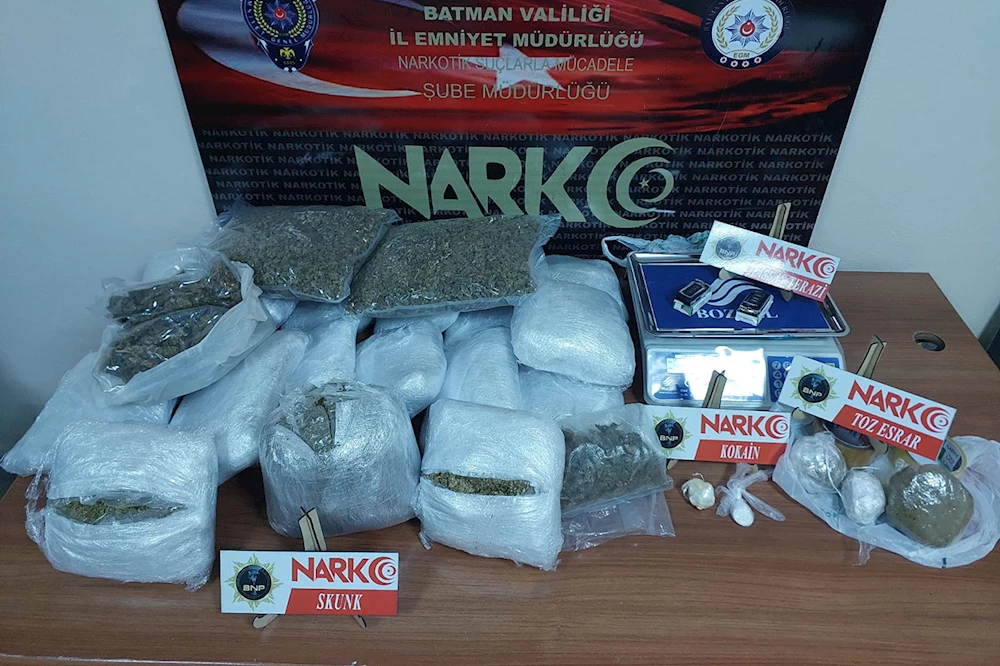 Batman'da 12 kilo uyuşturucu ele geçirildi: 3 kişi tutuklandı Batman Valiliğinden yapılan açıklamada, tespit edilen iki farklı ikamette Cumhuriyet Savcısı'nın talimatıyla eş zamanlı olarak adli arama yapıldığı bildirildi. Yapılan ikamet aramasında; satışa hazır halde paketlenmiş halde 11 kilo 543 gram skunk uyuşturucu madde, 487 gram toz esrar uyuşturucu madde, 19 gram kokain uyuşturucu madde ve 3 uyuşturucu madde tartımında kullanılan hassas terazi ele geçirildiği belirtildi. Olayda gözaltına alınan 3 şüpheli sevk edildiği adli mercilerce tutuklanarak cezaevine teslim edildiği kaydedildi.