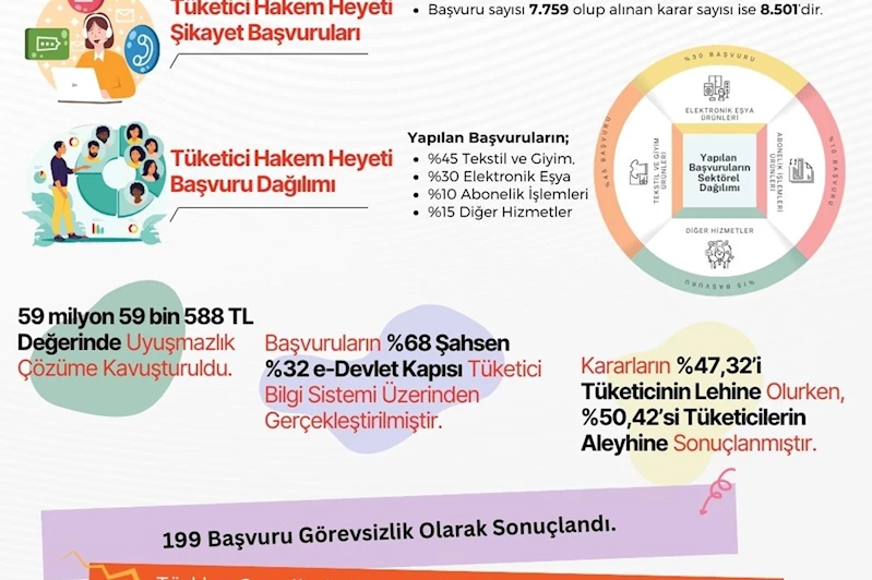 Buna göre Tüketici Hakem Heyeti’ne başvuru sayısı 7 bin 759 oldu. Başvuruların yüzde 45’i tekstil ve giyim ürünleri, yüzde 30’u elektronik eşya ürünleri, yüzde 10’u ise abonelik sözleşmelerinden yapıldı.