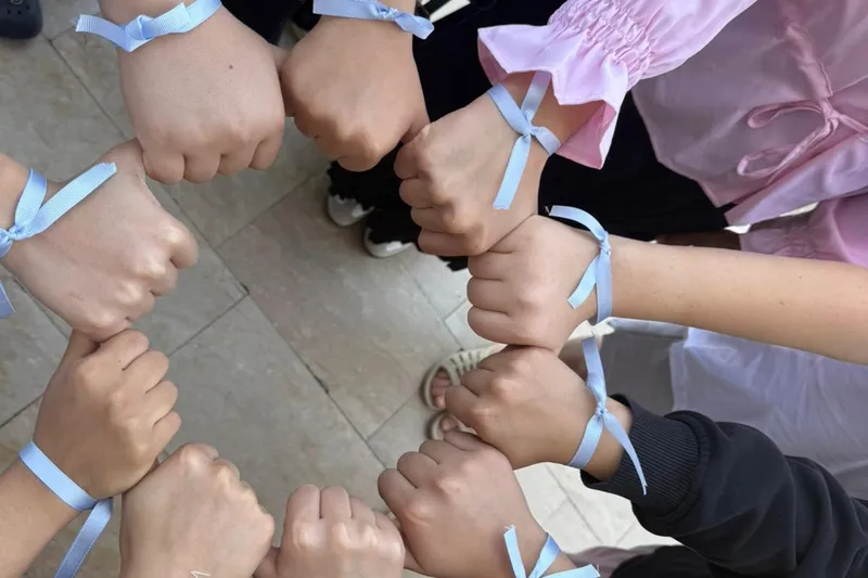 Etkinliğe katılan öğrenciler, dayanışmayı simgeleyen mavi kurdeleler takarak Filistin halkına desteklerini ifade etti.