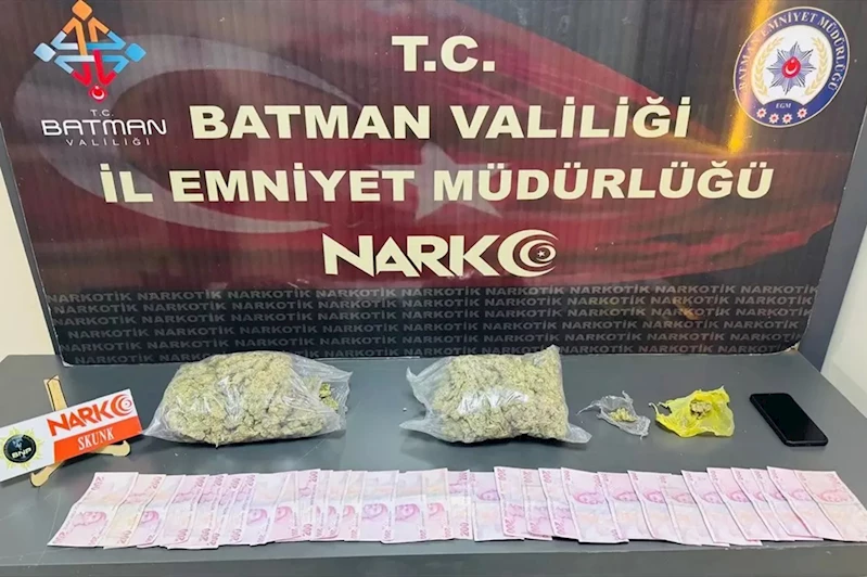 Aramada, şeffaf torbalar içerisinde 1 kilo 55 gram skunk ve 6 bin 200 lira para ele geçirildi.
