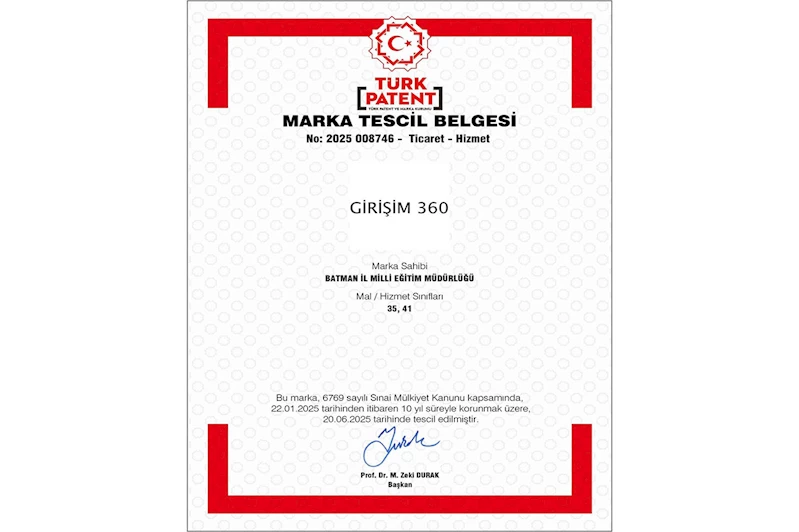 Marka tesciliyle birlikte Girişim 360’ın, hem Batman’da hem de Türkiye genelinde eğitim ve inovasyon alanında daha görünür bir kimlik kazanması hedefleniyor. (İLKHA)