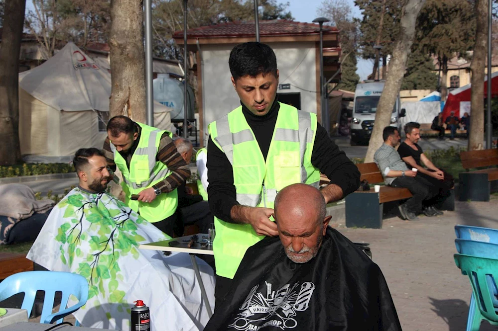 Batman Esnaf Sanatkârlar Odası'na üye çok sayıda berber, Umut Kervanı'nın Adıyaman'daki operasyon merkezi depremzedelere yönelik ücretsiz tıraş hizmeti verdi.