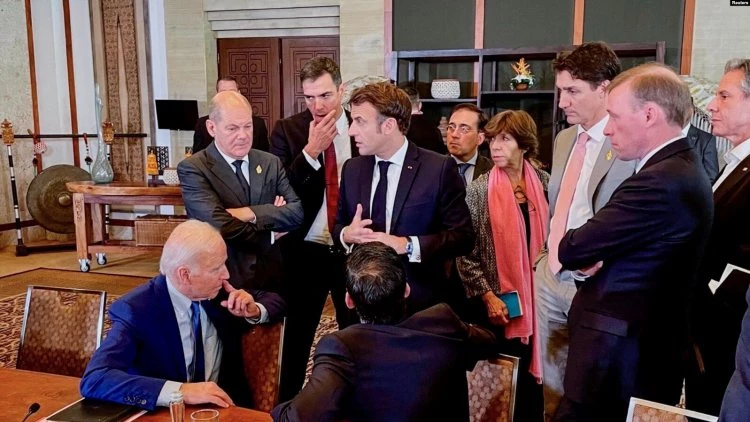Almanya Başbakanı Scholz(ayakta solda) Fransa Cumhurbaşkanı Macron(ayakta sağda) ABD Başkanı Biden (solda) İngiltere Başbakanı Sunak(sağda)