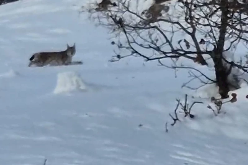 Vaşağı gören vatandaşlar, nadir görülen bu yaban hayvanını cep telefonlarıyla kaydetti.  (İLKHA)