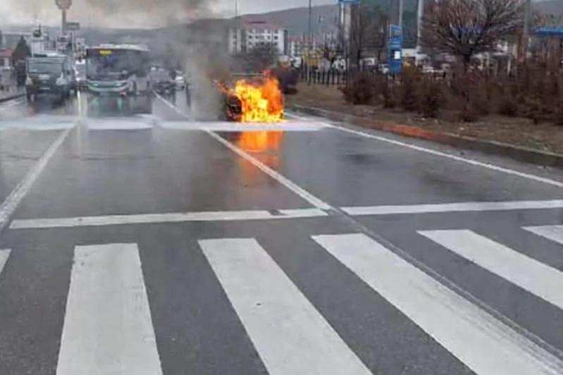 Seyir halindeyken bilinmeyen bir nedenle yanmaya başlayan araçtan yoğun dumanlar yükselirken, çevredeki vatandaşlar durumu hemen itfaiye ekiplerine bildirdi.