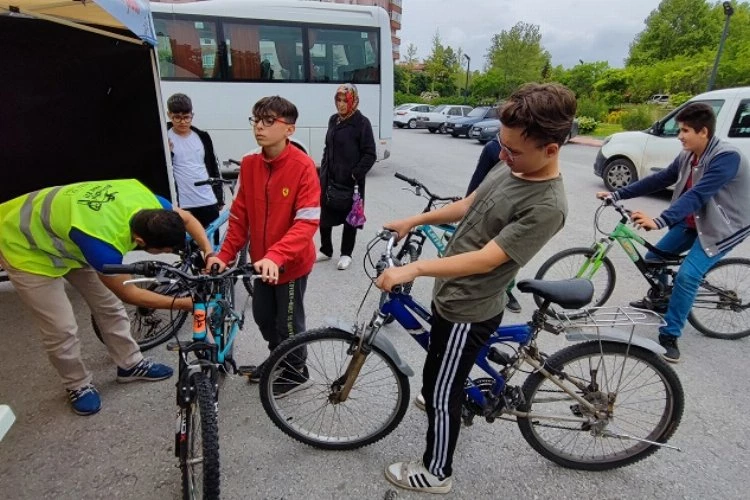 Bisiklet tamir ve bakım çadırlarında fren ayarı, fren teli, pedal, lastik tamiratları, zincir ve pedalların yağlanması gibi hizmetler ücretsiz sunuluyor.