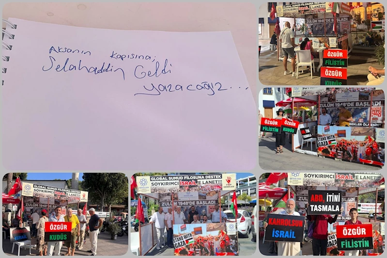 "Gazze'de süregelen insanlık dramına dikkat çekmek ve insani yardım malzemeleri taşıyan Sumud Filosu'na destek vermek amacıyla Bodrum İskele Meydanı'nda bir destek standı açmış bulunuyoruz. Filo Gazze'ye ulaşana dek, üyelerimiz ve gönüllülerimiz bu stantta dönüşümlü olarak nöbet tutacak, imza defteri ile halkımızın duyarlılığını kayıt altına alacağız. Ayrıca derneğimizin tanıtım broşürleriyle çalışmalarımızı kamuoyuna aktaracağız. Bizler inanıyoruz ki; sessiz kalmak, zulmü onaylamak anlamına gelir. Bodrum halkını insanlık onurunu savunmaya, Gazze halkının yanında olduğumuzu haykırmaya davet ediyoruz." (İLKHA)