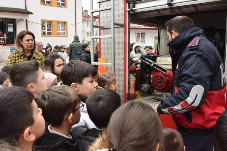 Bilecik’in Bozüyük İlçesinde İtfaiye ekipleri ilkokul öğrencilerine temel yangın eğitimi verdi.
