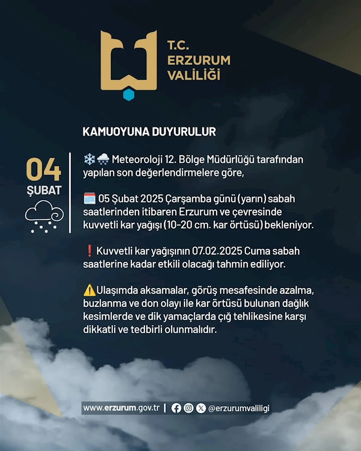 05 Şubat 2025 Çarşamba günü (yarın) sabah saatlerinden itibaren Erzurum ve çevresinde kuvvetli kar yağışı (10-20 cm. kar örtüsü) bekleniyor.
