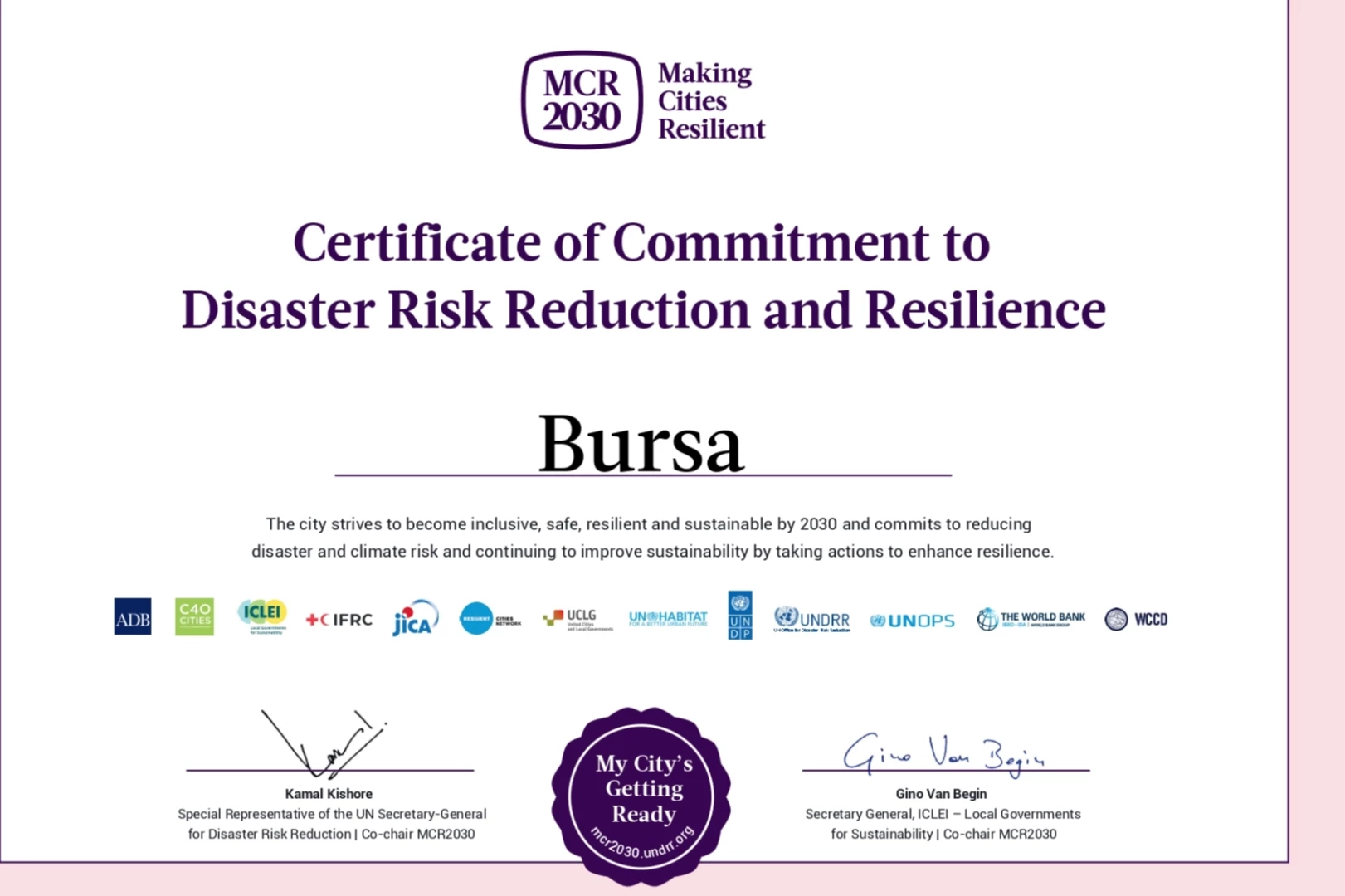 Bursa Büyükşehir Belediyesi, Birleşmiş Milletler (BM) bünyesindeki Afet Risk Azaltma Ofisi tarafından kentlerin afetlere karşı dirençli hâle getirilmesi, iş birliği yapılması ile karşılıklı bilgi ve tecrübelerin paylaşılması amacıyla başlatılan ‘Making Cities Resilience 2030’ (MCR2030) (Şehirleri Dirençli Hale Getirmek) programına üye oldu.