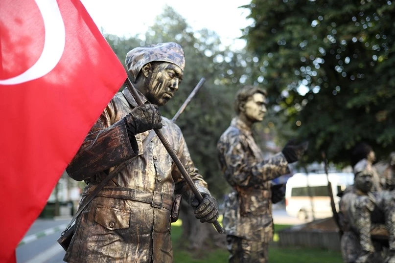 Kurtuluş Savaşı'nda mücadele etmiş sembol karakterlere hayat veren canlı heykeller, Bursa'nın Gemlik ilçesinde kurtuluşun 102'inci yıl dönümü etkinlikleri kapsamında İskele Meydanı'nda sergilendi.
