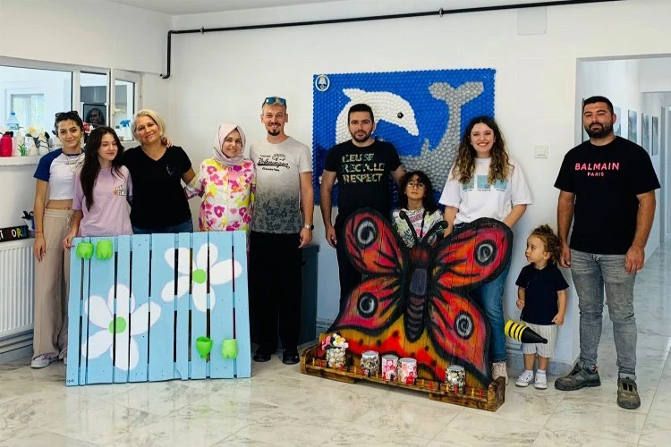 Dolgu alanındaki müdürlük binasında yapılan çalışma ile atık paletlerden saksı standı, metal konserve kutusu ve petlerden saksı, metal ve plastik şişe kapaklarından tablo ve süs eşyaları üretildi.