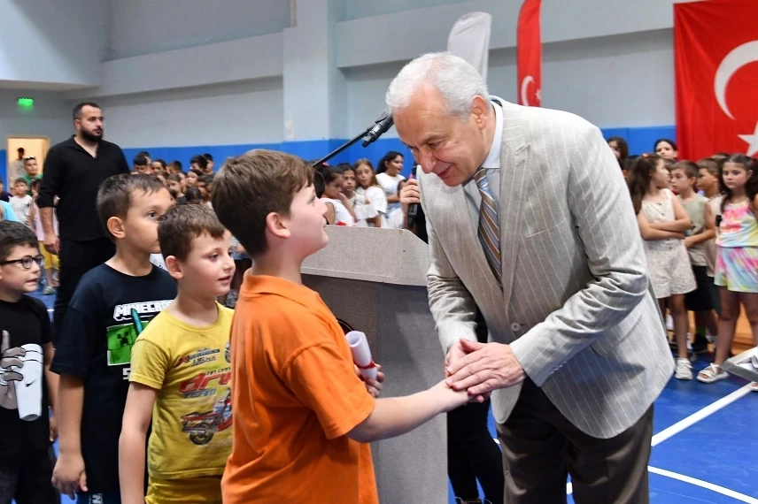 BURSA (İGFA) - Yaz spor okulları kapsamında; basketbol, güreş, badminton, masa tenisi, cimnastik, karate, voleybol, okçuluk ve dart olmak üzere 9 ayrı branşta eğitimlerini tamamlayan öğrenciler, verimli bir yaz tatili geçirme fırsatı buldular. Uzman eğitmen kadrosu ile eğitimlerini tamamlayan öğrenciler, Belediye Başkanı Şükrü Erdem’in elinden başarı sertifikalarını aldılar.