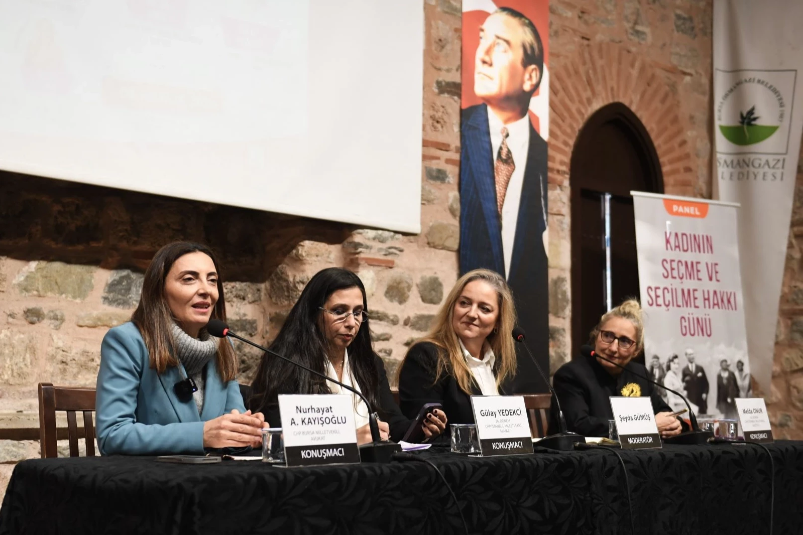BURSA (İGFA) - Panelde gazeteci Şeyda Gümüş moderatörlüğünde Ördekli Kültür Merkezi’nde düzenlenen “Kadının Seçme ve Seçilme Hakkı” panelinde CHP Bursa Milletvekili NurhayatAltaca Kayışoğlu, CHP 25 ve 26. Dönem İstanbul Milletvekili Gülay Yedekçi ve CHP 24. Dönem İstanbul Milletvekili Melda Okur, konuşmacı olarak katılarak kadının toplumda, yaşamda ve siyasetteki yerine değinerek haklarını konuştu. Kadınlara seçme ve seçilme hakkının verilişinin 90’ıncı yıl dönümünde düzenlenen panele Osmangazi Belediye Başkanı Erkan Aydın, Bursa Büyükşehir Belediye Başkan Vekili Sinan Nergiz, Osmangazi Belediye Başkan Yardımcısı Mutlu Esendemir ve Osmangazili kadınlar katıldı.