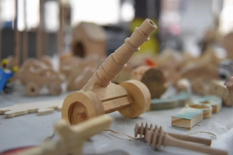Bursa'da Yıldırım Belediyesi Sosyal İnovasyon ve Girişimcilik Merkezi kursiyerleri, atık ağaç parçalarını Yıldırımlı minikler için oyuncağa dönüştürüyor.