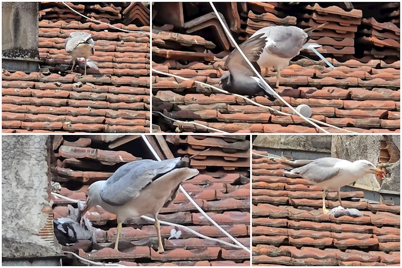 Görüntülerde martının, çatıda duran güvercine aniden saldırdığı kısa sürede güvercini etkisiz hale getirdiği ve avını yemeye başladığı görülüyor.